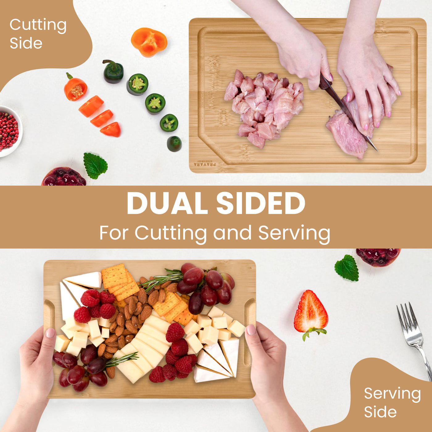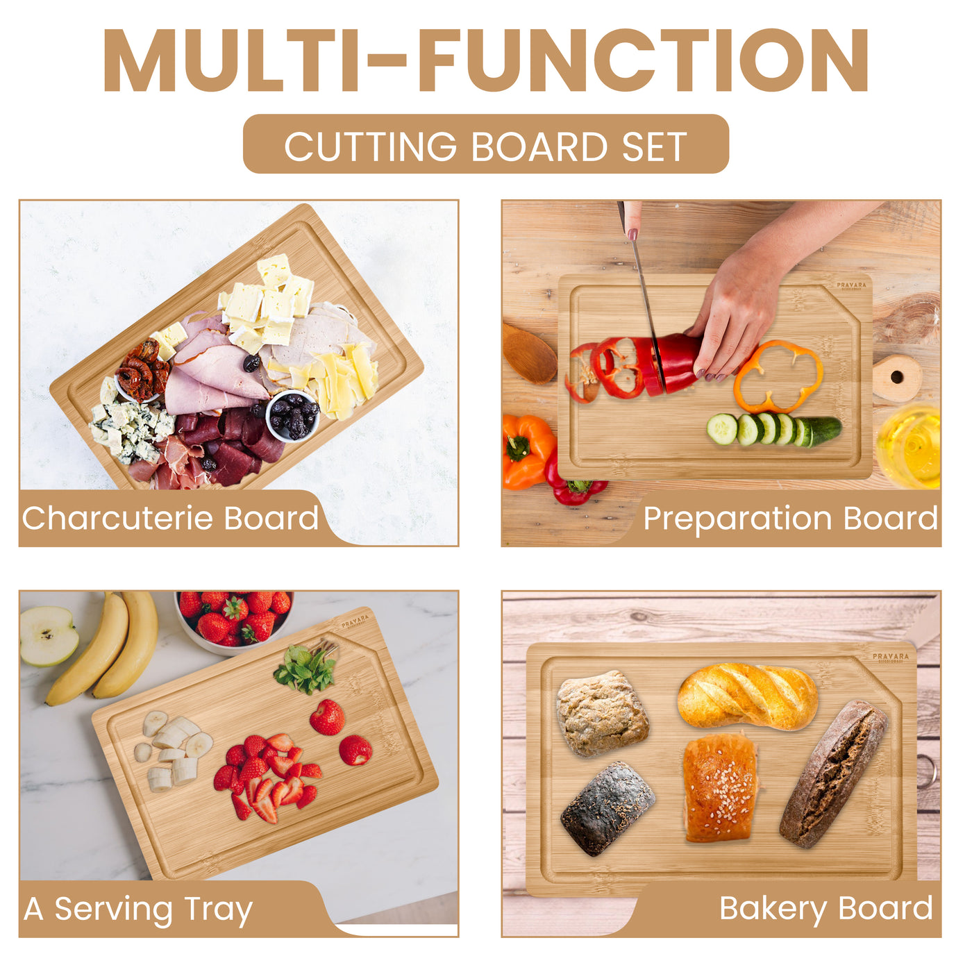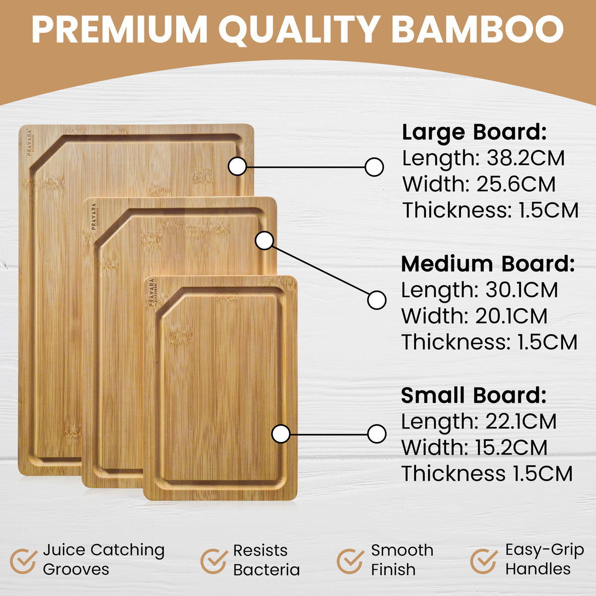 [VERSATILE] The Pravara chopping board set is made from natural hardened bamboo for a long life and minimal damage. These bamboo chopping boards for kitchens are perfect for meat, vegetables or fish.