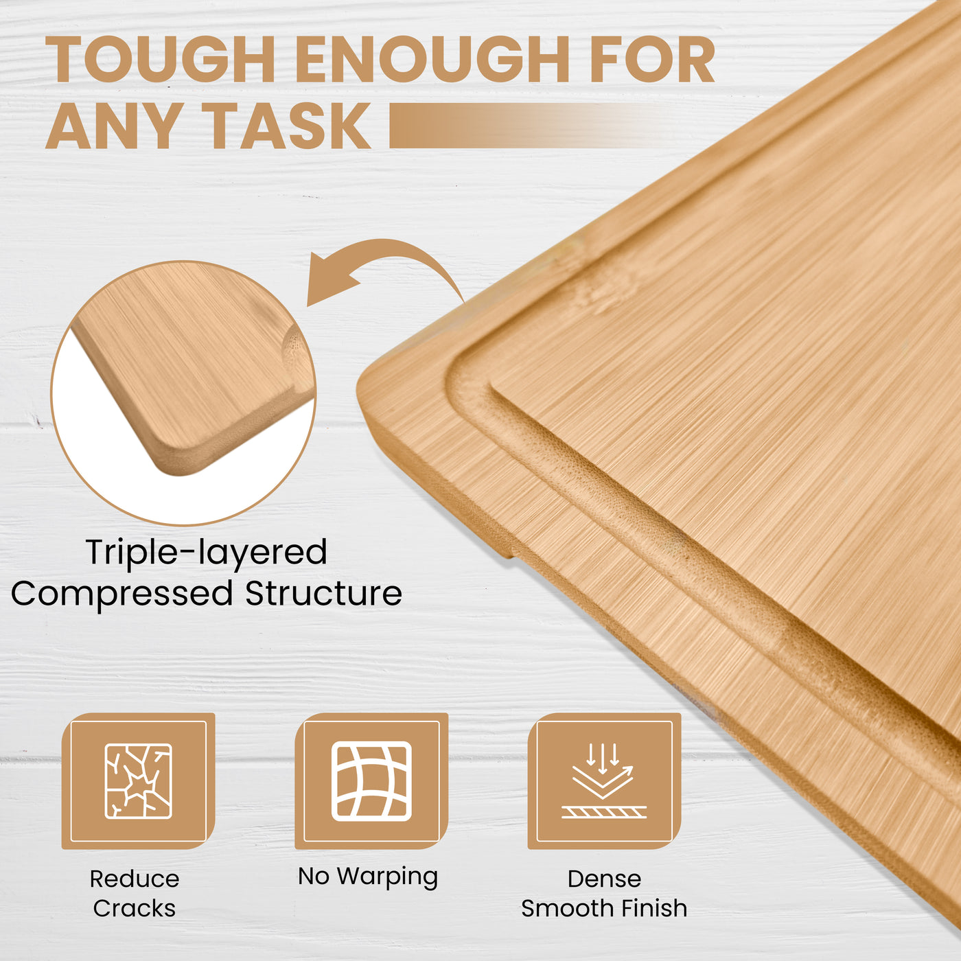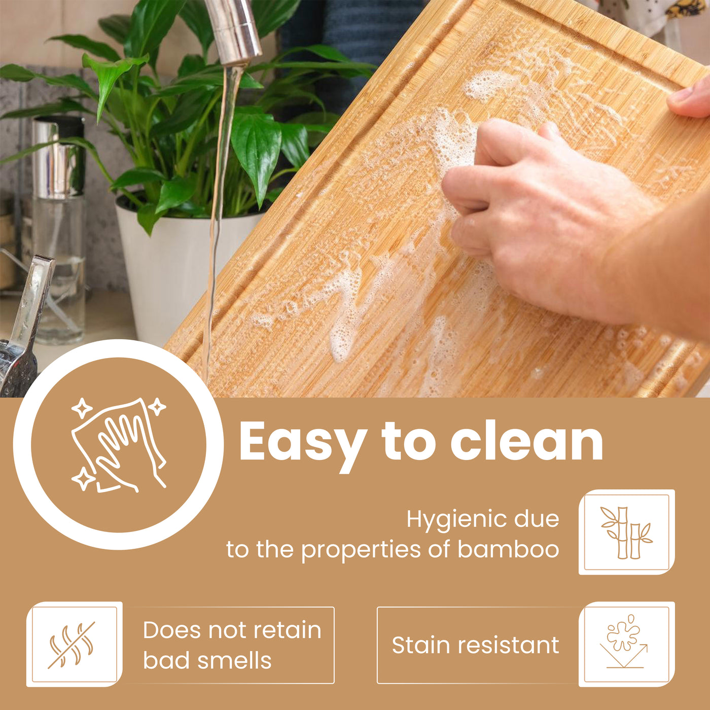 [CONVENIENT] Engineered juice well to collect unwanted juices, catches any excess liquid before it overflows the chopping board. Strong bamboo is the perfect chopping board wood for longevity.