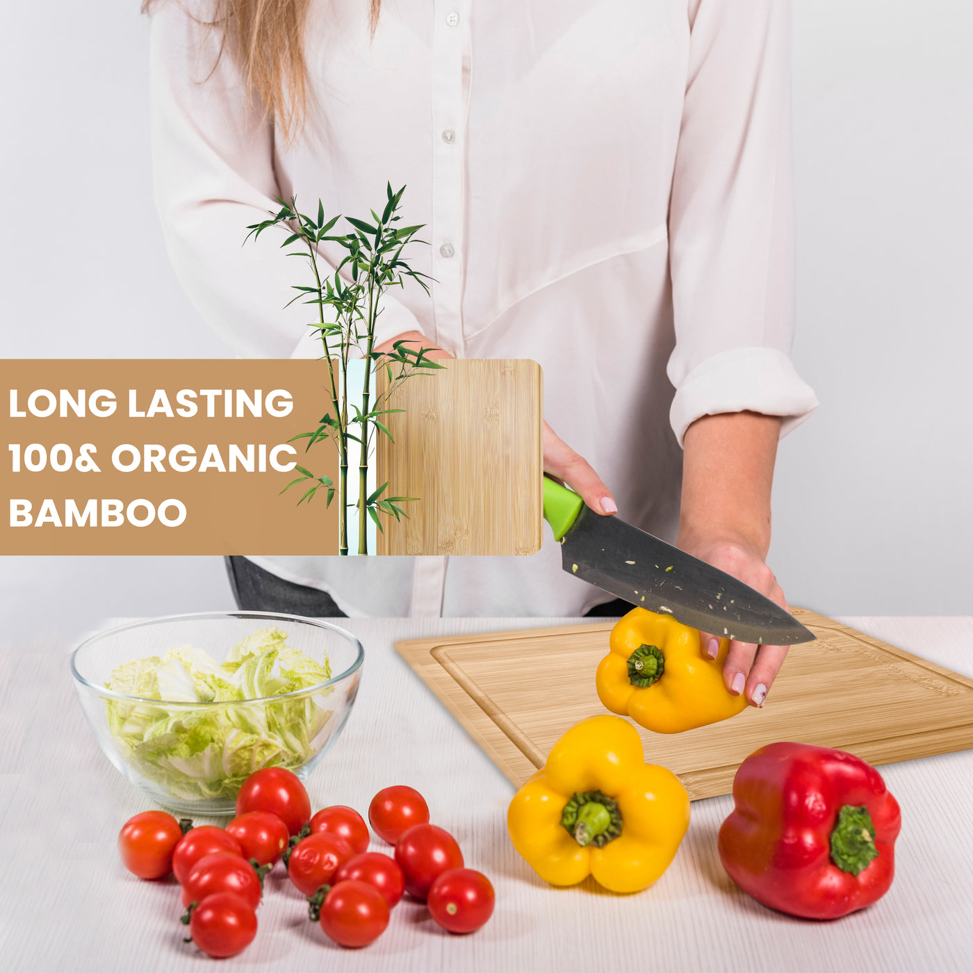[COMPACT] Carefully engineered bamboo wooden chopping board set ensures longevity and wont crack. Easy to clean & store, designed to blend seamlessly into any kitchen adding elegance to your pantry.